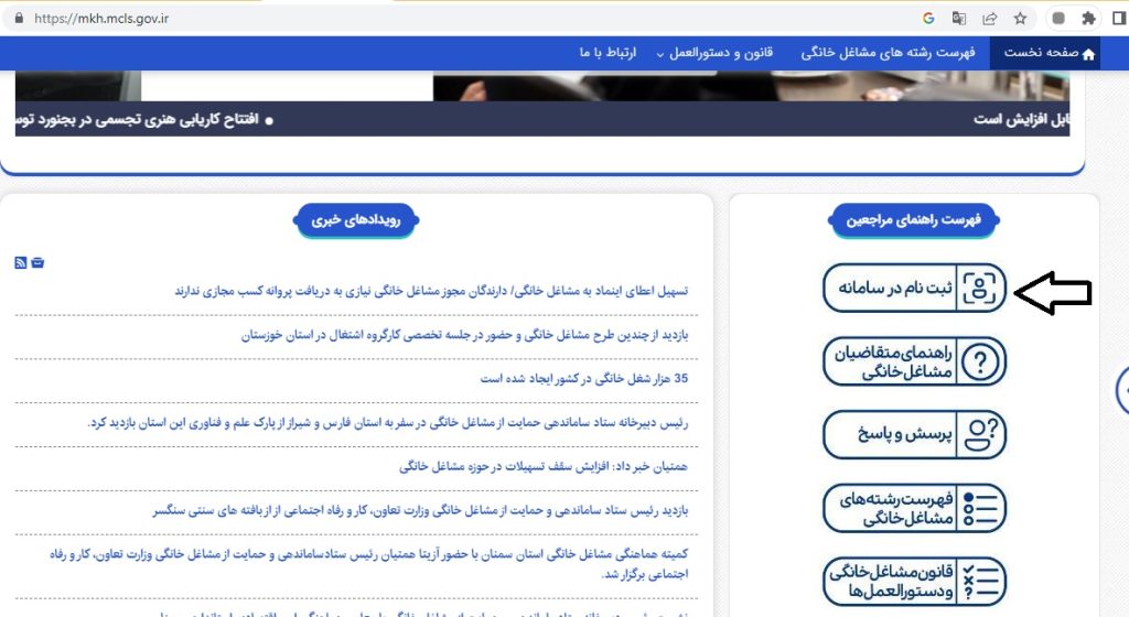 – در این سایت به دنبال بخش مشاغل خانگی میگردید، پس از وارد شدن به این بخش، بر روی لینک سامانه ثبت نام مشاغل خانگی کلیک میکنید.
