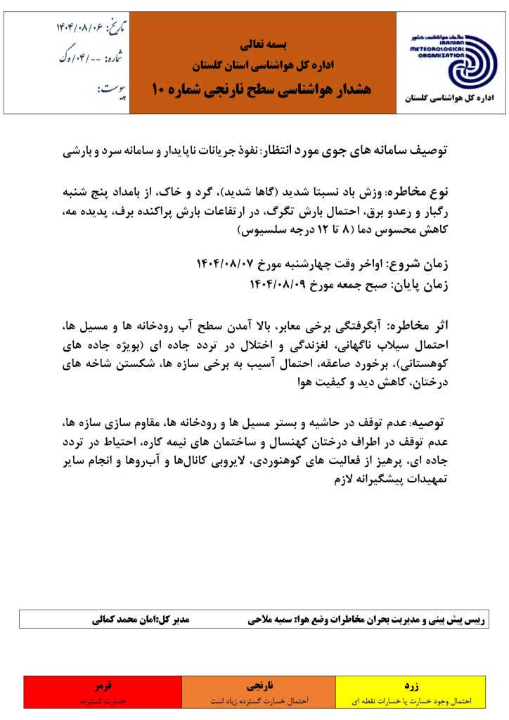 به گزارش پایگاه خبری تحلیلی گنبدیها، مدیرکل هواشناسی گلستان از صدور هشدار سطح نارنجی برای شهرستان گنبدکاووس خبر داد. بر این اساس، سامانهای سرد و بارشی از اواخر چهارشنبه تا صبح جمعه، این شهرستان شرق استان را تحت تأثیر قرار داده و موجب کاهش محسوس دما، وزش باد شدید و بارشهای رگباری همراه با رعد و برق خواهد شد.